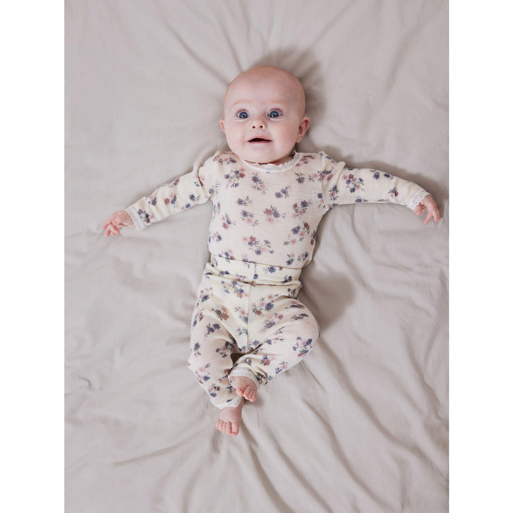 Dessa leggings är tillverkade av högkvalitativ ull som garanterar både komfort och mjukhet. Materialets egenskaper bidrar till att hålla ditt barn varmt på kyliga dagar och är skonsamt även mot känslig hud. Designen är underbart barnvänlig med en lekfull upprepning av mönster över hela ytan, vilket skapar en rolik och stilfull look.