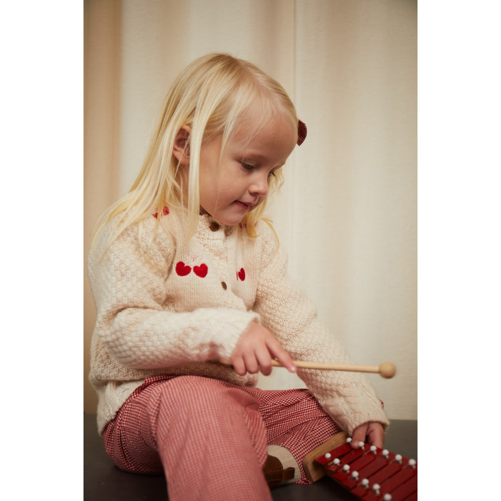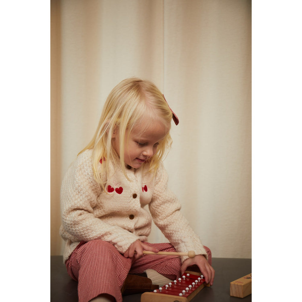 Upptäck värmen och charmen hos vår Copenhagen Colors Cream Lambwool Cardigan med dekorativa rosettutsmyckningar. Tillverkad i högkvalitativ lammull, erbjuder denna kofta både oöverträffad mjukhet och isolering, perfekt för att hålla ditt barn varmt under kyliga dagar. Dess eleganta rosettutsmyckningar tillför en viss charm och gör varje outfit komplett, oavsett om det är till vardags eller till fest. Vår lambwoolskofta i krämig beige nyans är lika praktisk som den är stilfull. Designen är tidlös och det generösa passformet gör att den sitter bekvämt på ditt barn, medans de håller sig rörliga och aktiva. Tack vare den förstklassiga lammullen håller koftan hög kvalitet och tål att bäras om och om igen, samtidigt som den är lätt att sköta om. Denna mångsidiga cardigan kan enkelt kombineras med olika typer av kläder och är perfekt för allt från en avslappnad dag i parken till ett mer uppklätt familjeevenemang. Den erbär en smart och hållbar investering som håller barnet både varmt och stilsäkert säsong efter säsong.