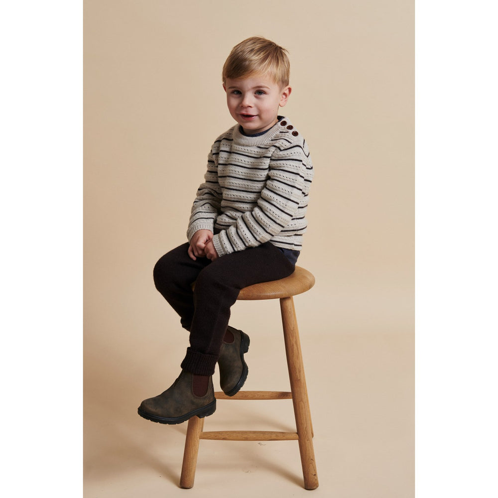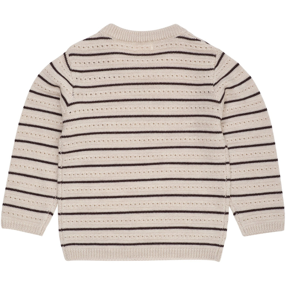 Denna charmiga stickade tröja från COPENHAGEN COLORS kombinerar stil med praktisk funktion och är framställd av 100% merinoull, vilket garanterar värme och komfort under kyliga dagar. Designen kännetecknas av ett elegant mönster med ljuskräm och mörkbruna kombinationsränder samt klassisk rund hals och långa ärmar, vilket gör den till en mångsidig del av varje barns garderob. Tröjans skötselråd är lika enkla, vilket innebär enkel underhållning och längre hållbarhet. Perfekt för allt från lekfulla höstdagar till vintervandringar, denna tröja kombinerar mode med funktionalitet på bästa sätt.