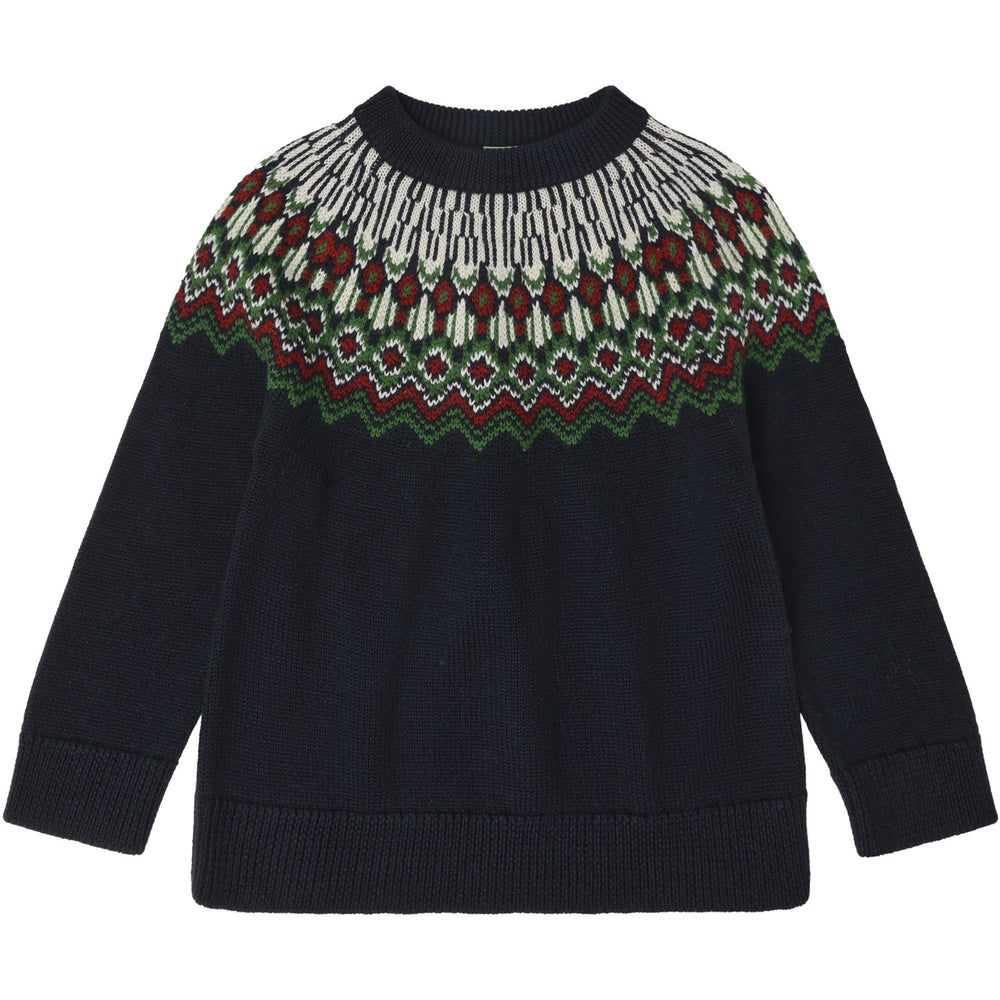 Upptäck vårt mjuka och miljövänliga barnplagg - FUB Dark Navy Fair Isle Sweater. Denna långärmade tröja är perfekt för kalla dagar och tillverkad av 100% OEKOTEX®, RWS- och BLUESIGN-certifierad merinoull, vilket garanterar högsta kvalitet och omsorg för miljön. Tröjans design präglas av en elegant Fair Isle-inspirerad grafisk panel, vilket ger ett traditionellt men modernt uttryck.