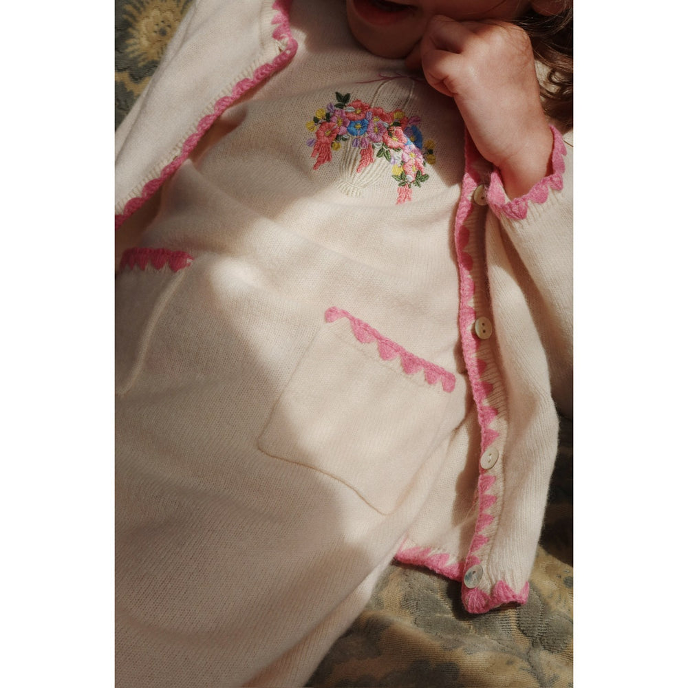 Vår Konges Sløjd Collette stickad cardigan i off white är perfekt för kyliga dagar. Den är tillverkad i 100% mjuk ull och pryds av delikata blombroderier. Med klassiska pärlemorknappar som detalj är denna cardigan inte bara stilfull utan även praktisk. Bekvämligheten och passformen är idealisk för barns lek och rörelse, och den hållbara kvaliteten säkerställer att koftan kan bäras om och om igen. Elegant och funktionell – en storfavorit i barnens garderob!