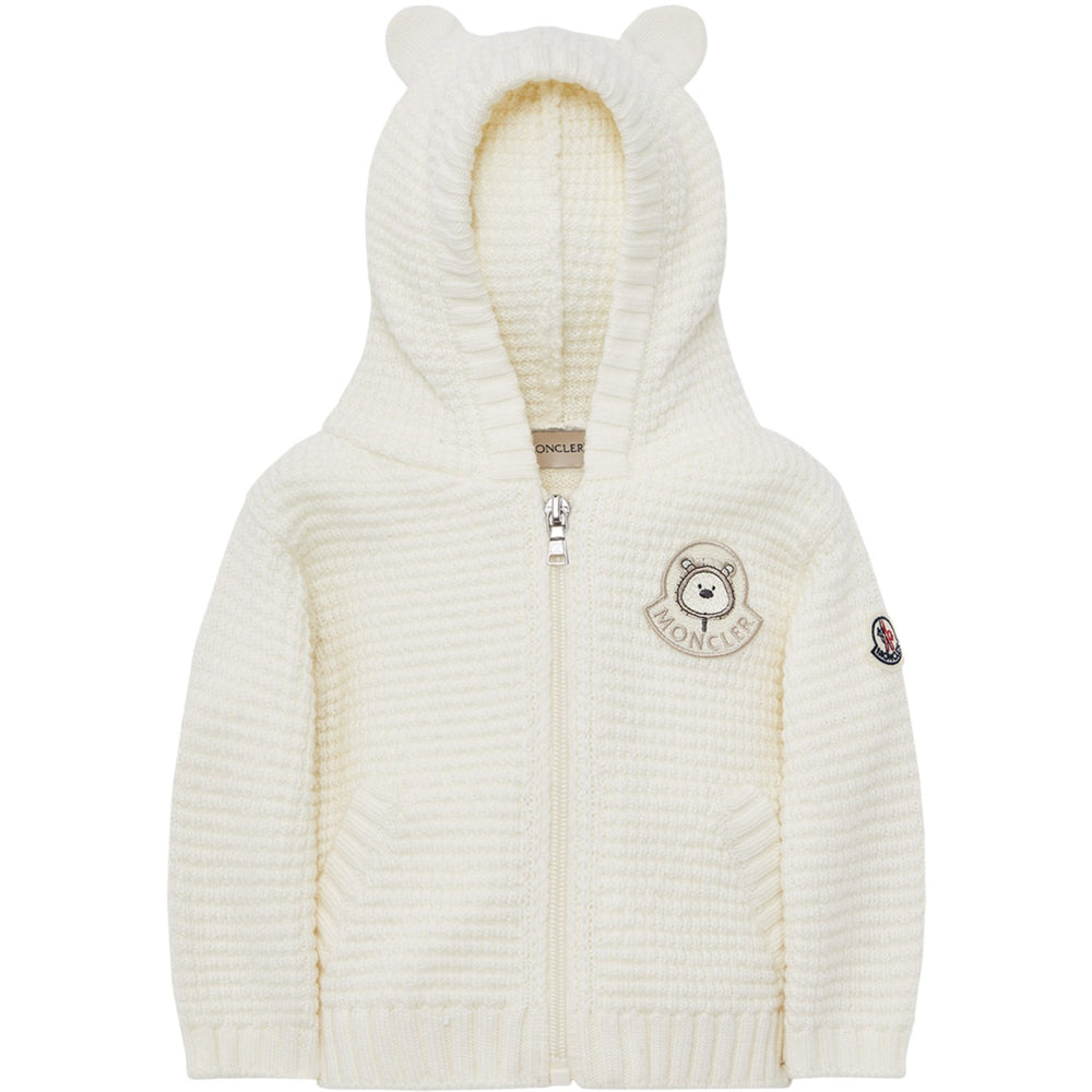 Svep in din lilla äventyrare i denna charmiga ljusbeige kofta från Moncler! Den är tillverkad av lyxig, mjuk ull och är precis rätt för gosstunder eller eskapader på lekplatsen. Dess våffelstickade struktur ger mysig värme, medan den bedårande huvan med nallebjörnsöron ger leenden och kängurufickorna håller små händer varma. Den ikoniska Moncler logotypen lapp lägger till en touch av chic stil, vilket gör denna zip-up kofta till ett härligt val för både pojkar och flickor . En perfekt blandning av nöje och funktion, den kommer garanterat att bli ett älskat tillskott till ditt barns garderob.