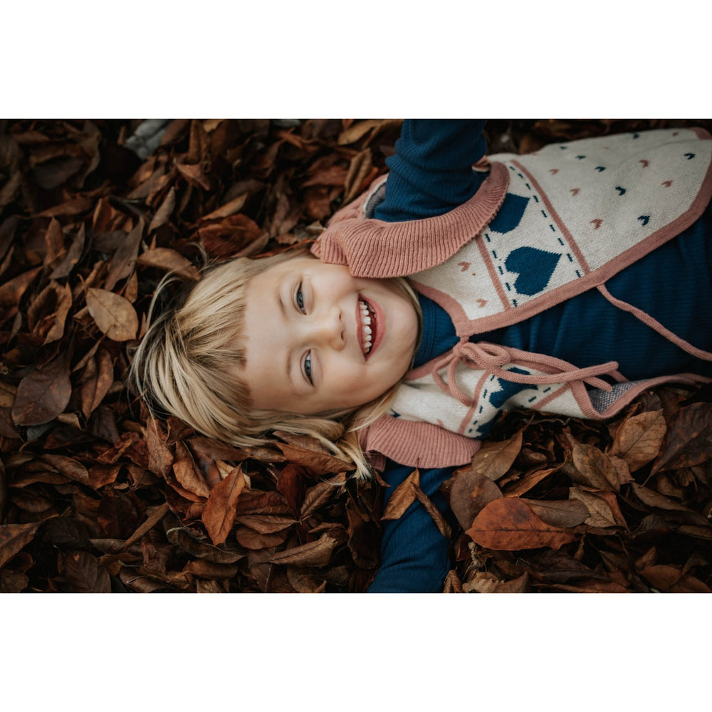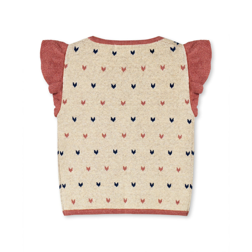 Förvandla din lilla ängels garderob med Fliink Sandshell Nova Multi Heart Väst. Denna bedårande stickade väst är tillverkad av 85% ekologisk bomull och 15% ull, vilket erbjuder både hållbarhet och komfort. Det charmiga hjärtmönstret i jacquardstickning tillsammans med de söta volangerna vid axlarna tillför en lekfull touch, medan de knytbara banden fram låter dig justera passformen till perfektion. Kontrastkanter längs med framkanten, halsen och nederdelen framhäver designen ytterligare. Denna väst är inte bara skön att bära, den är också praktisk att sköta om; den tvättas enkelt i maskin på ett skonsamt program vid 30°C och bör läggas platt vid torkning för att behålla sin form. Det är en stilfull och funktionell tillägg till varje barns klädskåp!