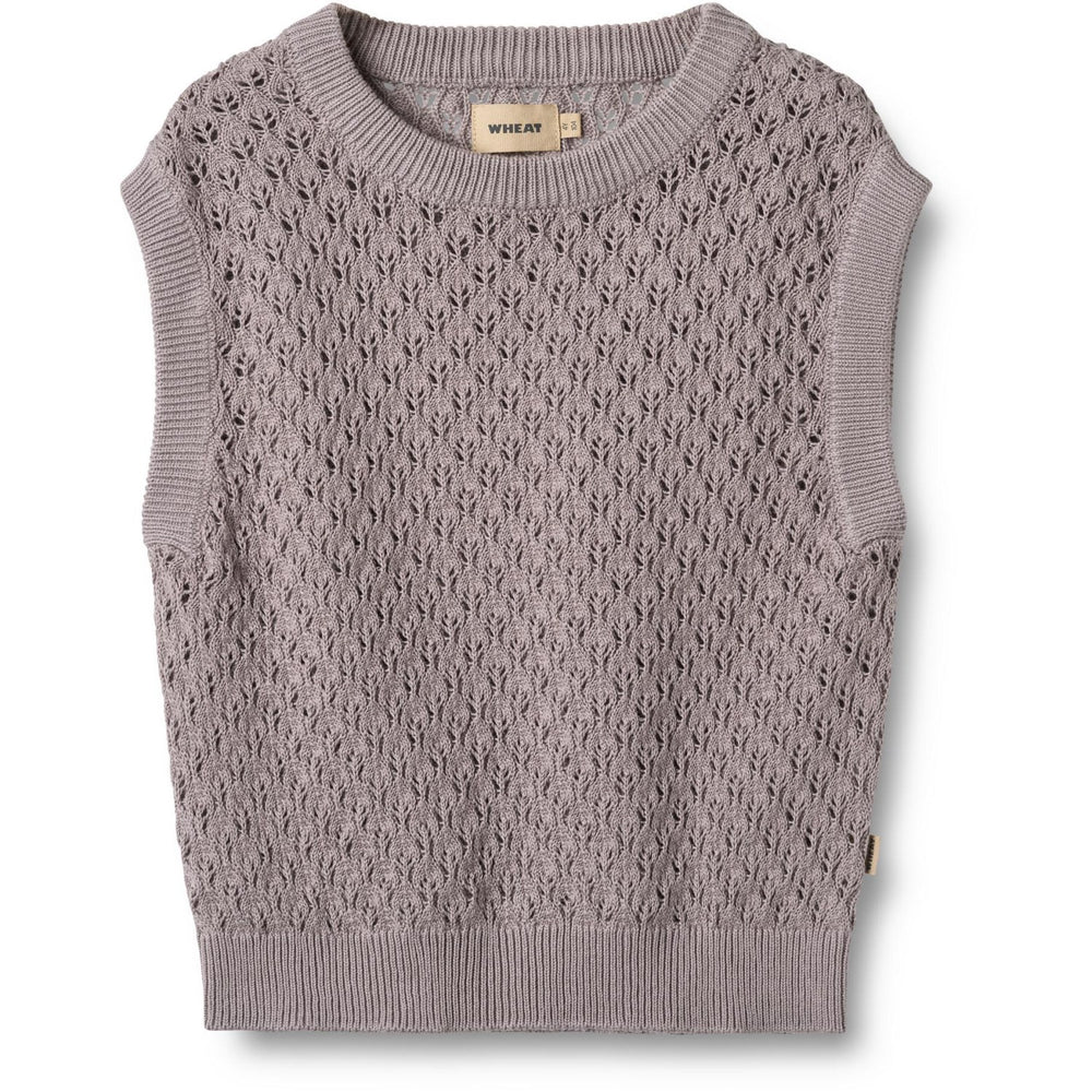 Det detaljerade stickade mönstret i spets lägger till en touch av unikhet och stil medan ribben vid halsringning, ärmöppningar och nederkant bidrar med komfort och hållbarhet. Färgsättningen i dusty purple ger en mjuk och varm känsla som lätt kan matchas med andra plagg. Västen är praktisk, lätt att underhålla och maskintvättbar, vilket gör den idealisk för aktivt lek och daglig användning.är både stilfull och funktionell. Den tjänar väl som ett extra lager för kyliga dagar, och är också charmig över en skjorta eller klänning vid särskilda tillfällen, vilket gör den till en mångsidig del av barnets garderob.
