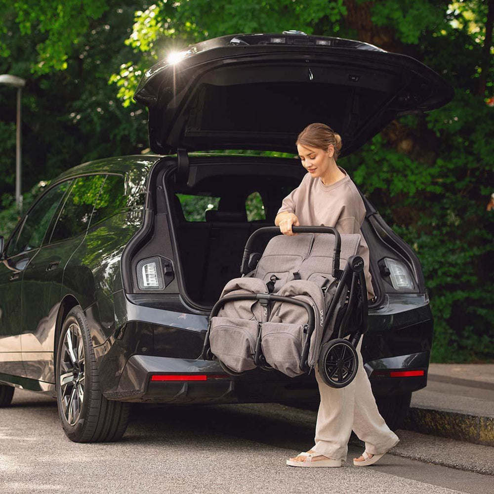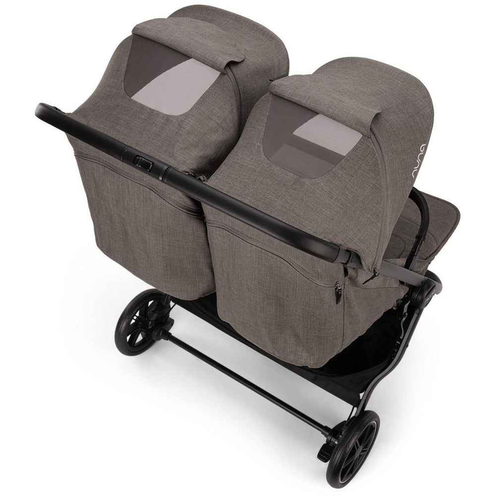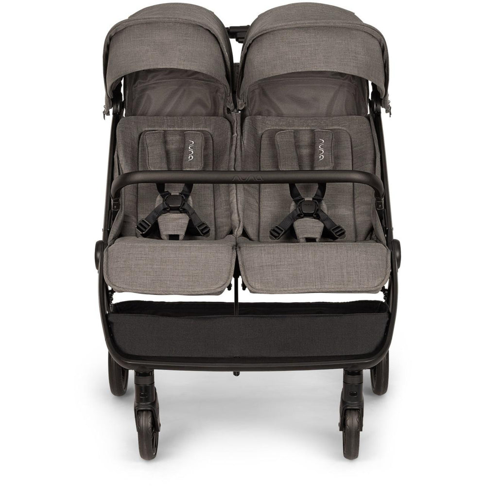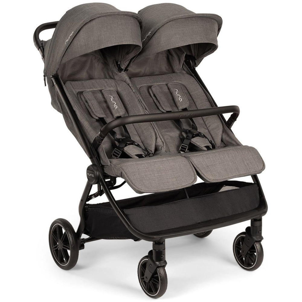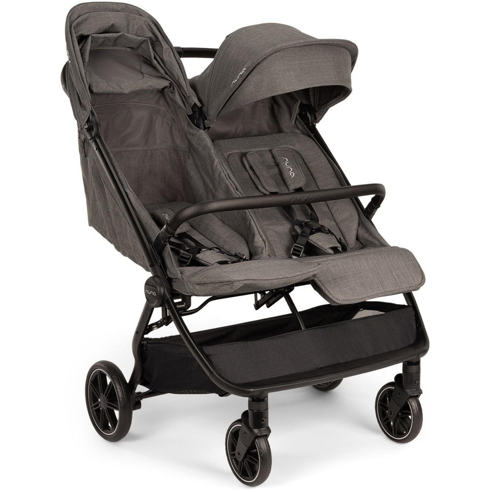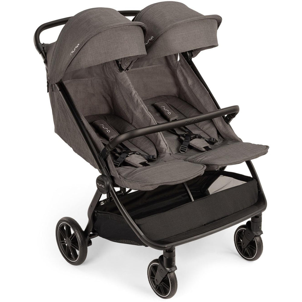 Nuna trvl™ dubl har andra viktiga specifikationer som enkel hopfällning med en hand, självstyrande MagneTech säkra snäppspännen™, och ett snabbinkopplande bakhjulsbromssystem för säkerhet. Det välvda vadstödet och nästan platt recline erbjuder optimalt stöd även för de minsta passagerarna. Med ett extra stort förvaringsutrymme som klarar upp till 10 kg och enkel åtkomst, blir ingen utflykt för besvärlig.