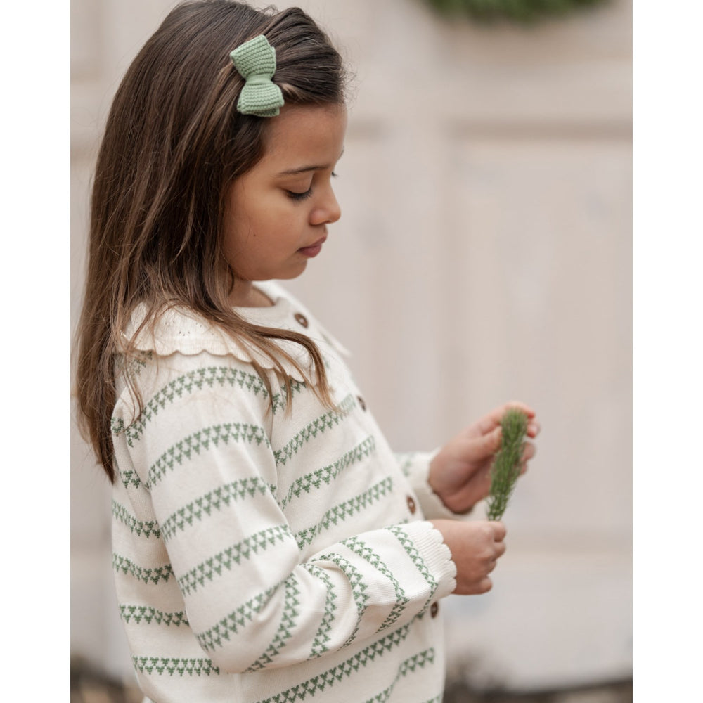 Denna charmiga Hanevild Shale Green Heart Cardigan är perfekt för ditt barns garderob. Tillverkad av 100% ekologisk bomull, erbjuder denna kofta inte bara mjukhet och komfort men är också skonsam mot känslig barnhud. Designen utstrålar en tidlös elegans med ett subtilt hjärtmönster, en dekorativ spetskrage och klassiska träknappar som tillför en rustik känsla. De spetsbeklädda botten- och ärmöppningarna förhöjer stilen ytterligare, och med matchande tildebyxor och tanja-rosett som finns tillgängliga, kan en komplett outfit skapas. Sköt om plagget enkelt genom att tvätta det i 30 grader och lägga det platt för torkning, vilket garanterar att cardiganen behåller sin form och kvalitet.