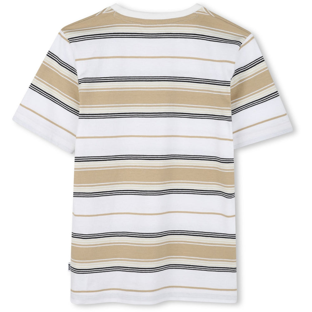 Den här kortärmade Hugo Boss t-shirten är perfekt för den lilla trendsättaren! Tillverkad av mjuk 100 % bomullsjersey och utsmyckad med eleganta ränder, garanterar den både stil och komfort. Den ikoniska "BOSS"-logotypen på bröstet och den subtila vävda etiketten på sidan ger en touch av lyx. En t-shirt som är perfekt för både lek och speciella evenemang.