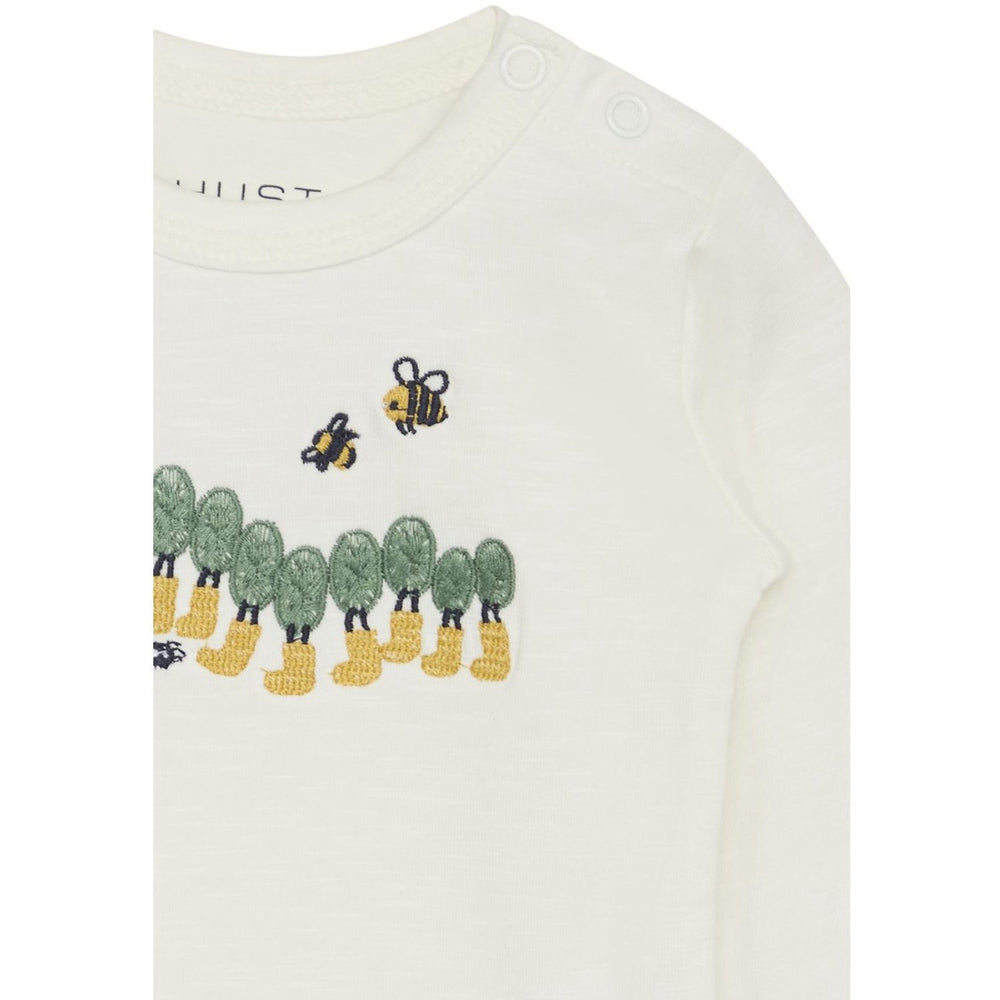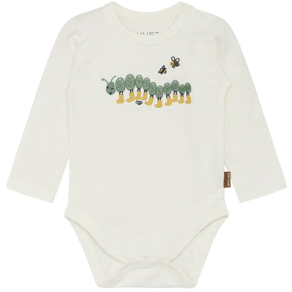 Upptäck vår charmiga långärmade bodystocking från Hust & Claire, perfekt för din lilla ängel. Tillverkad i skön bomull som är mjuk mot huden, med en lekfull broderad larv på magen. Enkel att ta på och av tack vare smarta knäppningar på vänster axel och mellan benen. Denna body kombinerar stil med komfort och är idealisk för både lek och sömn.