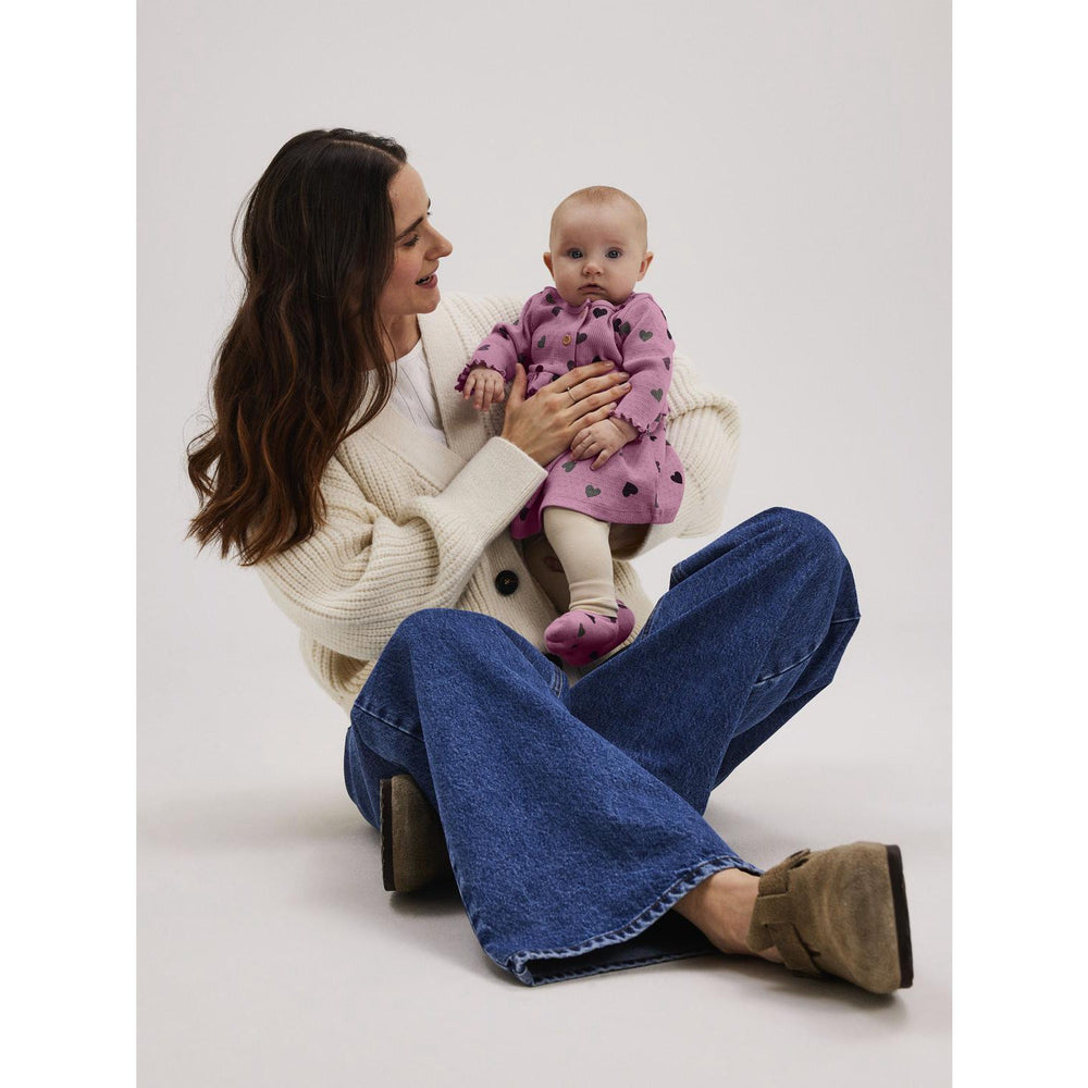 Uppdatera din lillings garderob med Name It Mauve Orchid Nitte Klänning – en stilren och bekväm klänning som fungerar perfekt för alla tänkbara tillfällen. Här får du en klänning tillverkad i ribbstickad design med ett elegant vertikalt, randigt mönster som bidrar till en klassisk och tidlös estetik. Den lugna mauve-färgen kompletteras av långa ärmar med babylock-kantade manschetter och en praktisk rund hals som gör påklädningen enkel tack vare knappar och tryckknappar vid stängningen. Klänningens normala passform och goda elasticitet erbjuder komfort och rörelsefrihet för ditt barn, vilket gör den till ett både snyggt och funktionellt val för vardag och fest.