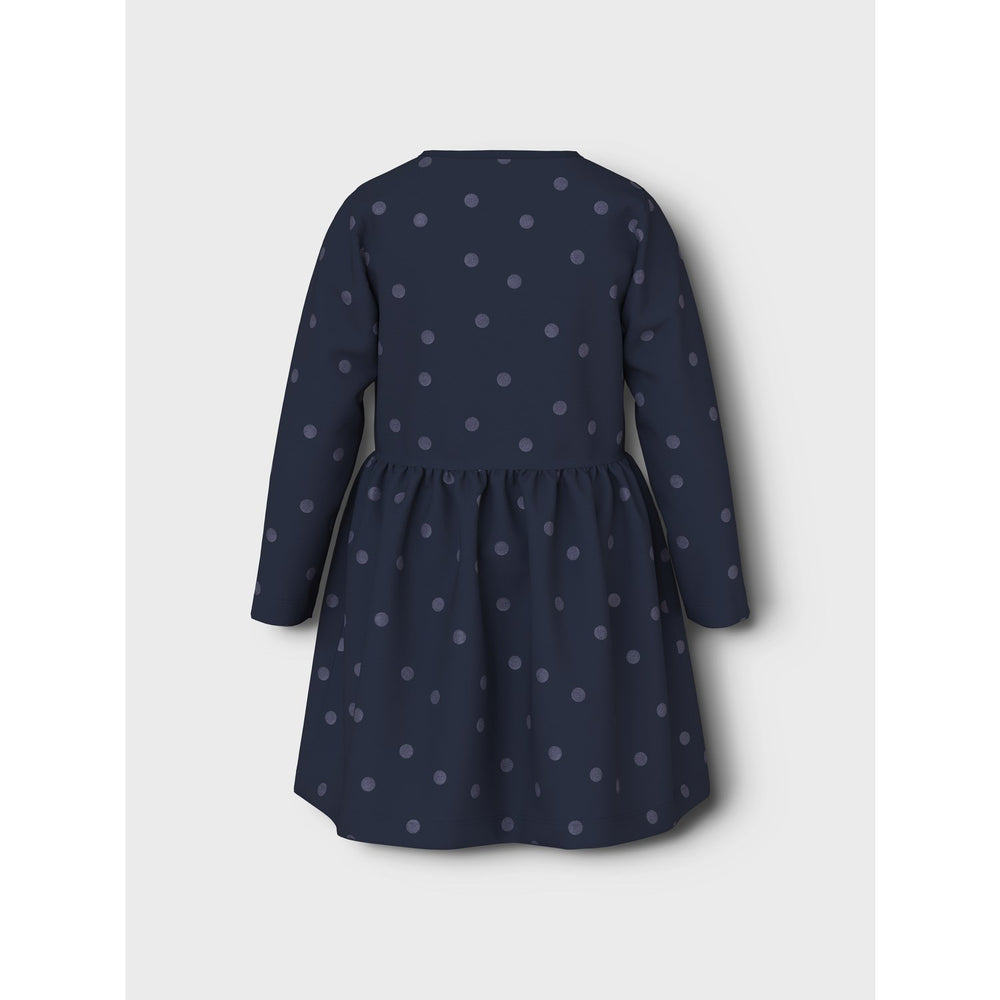 Designmässigt erbjuder klänningen en klassisk rund hals och långa ärmar. Den harmoniska färgen i marinblått kombinerat med ett lekfullt mönster som upprepas över hela klänningen tillför en stilren men rolig känsla. Passformen är normal, vilket gör den idealisk för barn i alla storlekar.