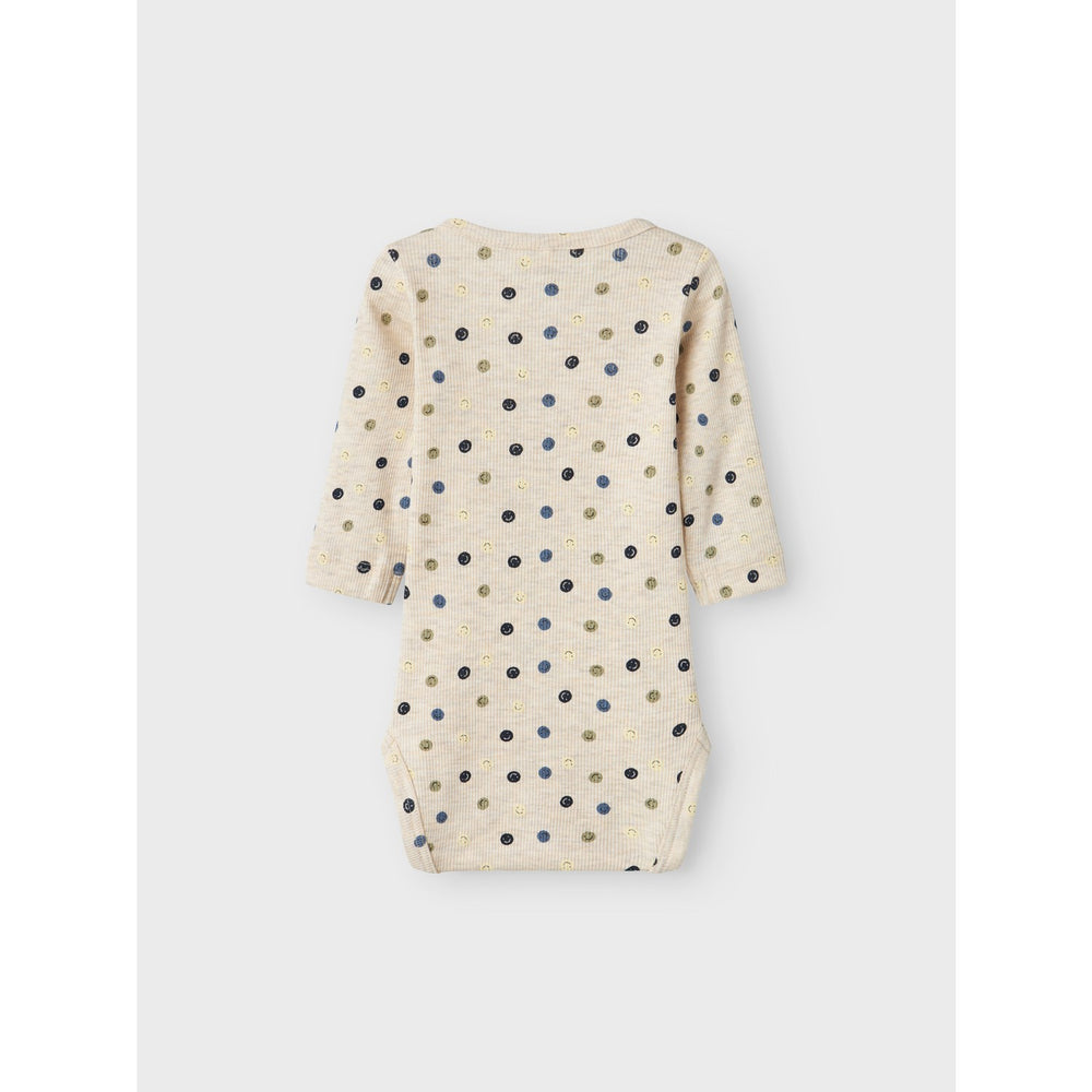 Den rundade halsen och långa ärmarna skyddar och värmer samtidigt som det enkla knäppningssystemet med tryckknappar underlättar på- och avklädning, vilket är praktiskt för både föräldrar och barn. Den repetitiva tryckta designen över hela ytan tillfogar en extra charm och gör varje bodysuit unik.