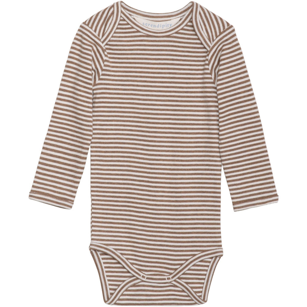 Denna charmiga babybody från Serendipity är perfekt för din lilla älskling. Tillverkad av 100% ekologisk bomull, kombinerar denna plagg mjukhet och hållbarhet med en stilren randig design i mandelbrunt och benvitt. Den unika kuvertdesignen vid axlarna underlättar påklädningen medan två tryckknappar vid benen försäkrar en säker passform. Dessutom är detta plagg GOTS-certifierat, vilket garanterar en miljövänlig och ansvarsfull produktion. En bekväm och snygg lösning för vardagen.