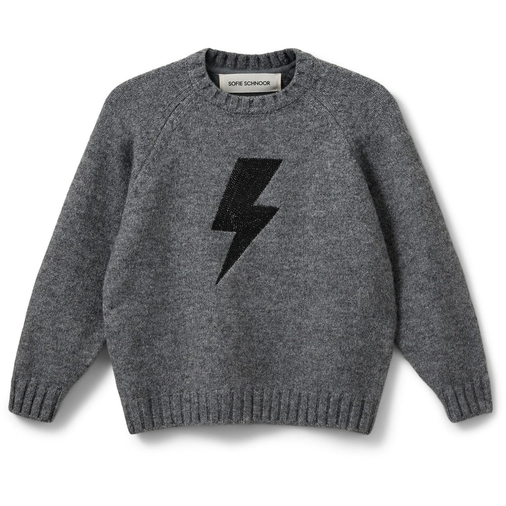 Sofie Schnoors stickade tröja i mörkgrått är den perfekta blandningen av stil och komfort. Den här tröjan är tillverkad i en mjuk och värmebevarande tygblandning som håller de små varma under kyliga dagar. Det lekfulla blixtmotivet ger en touch av skoj och gör den här stickade tröjan unik. Ett måste i varje barns garderob för de små modeälskarna!