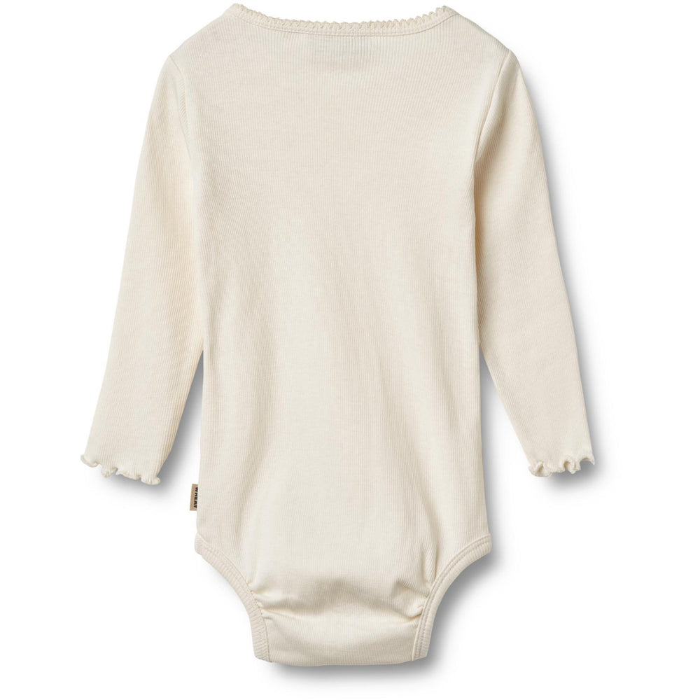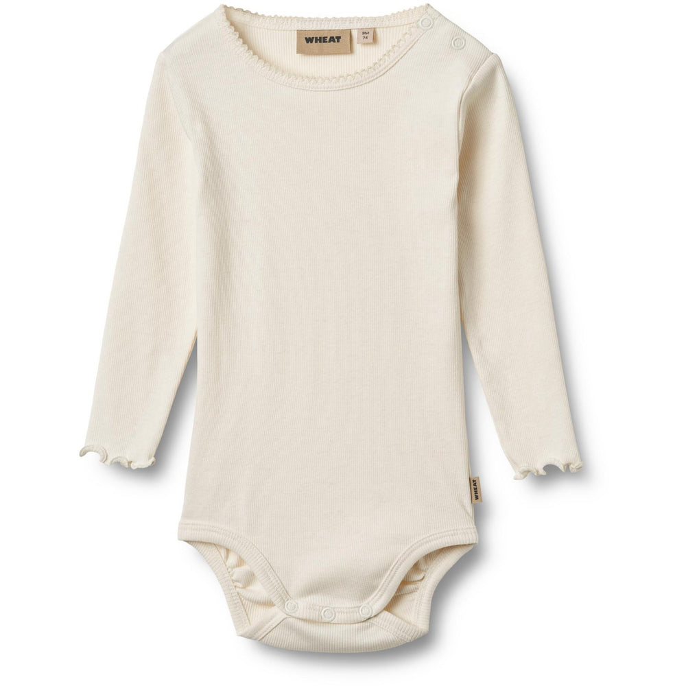 Upplev vardagskomfort med Wheat Ivory Body L/S Regitze, en långärmad ribbad body perfekt för din bebis. Tillverkad i mjuk, ekologisk bomull garanterar den både komfort och hållbarhet. Med en charmig bomullspikofärg och spetsdetaljer vid halsringningen samt volangkanter vid ärmsluten, kombinerar denna body stil med funktionalitet. Bodyn har en normal passform och är utrustad med praktiska tryckknappar vid axeln och grenen för enkel påklädnad och blöjbyte. Rynkningen bak på benet förbättrar passformen ytterligare och gör att din lilla kan röra sig fritt. Dessutom är materialet certifierat enligt Standard 100 av OEKO-TEX® och GOTS, vilket gör den till ett miljövänligt val. Idealisk både som enskilt plagg och lager på lager, Wheat Ivory Body L/S Regitze är en oumbärlig del av barnets garderob.