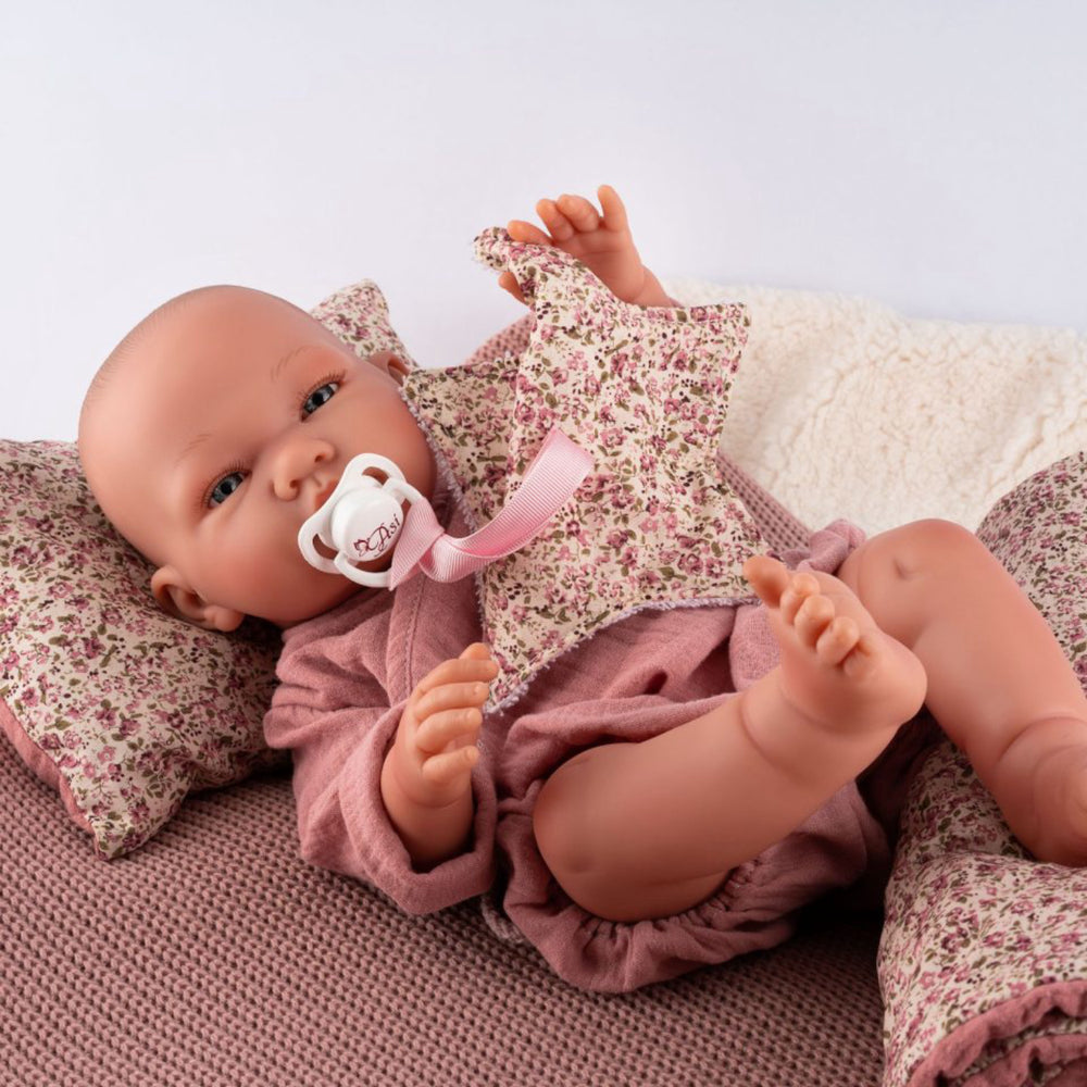 Suttekluden är inte bara en vanlig docktillbehör; den tjänar också som en napphållare, vilket garanterar att nappen alltid är nära till hands. Detta tillägg bidrar till lekens lätthet och bekvämlighet, samtidigt som det minimerar risken för förlorade nappar. Tillverkad i ett mjukt material med ett vackert vintagemönster i rosa nyanser, prytt med små blommor, erbjuder den både komfort och visuell stimulans.