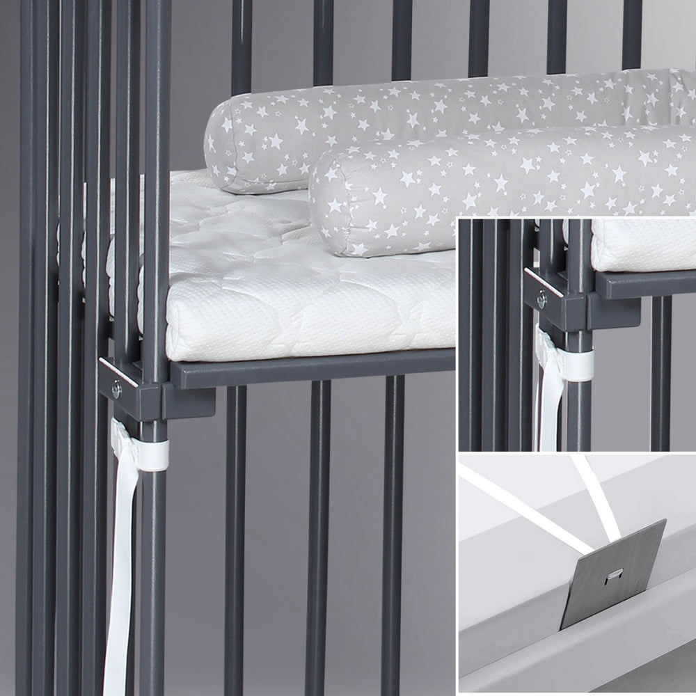 Babybay® Grey Varnished Boxspring XXL Co-Sleeper är den ultimata lösningen för föräldrar med höga sängar. Dess patenterade, steglösa höjdjustering garanterar en perfekt passform utan mellanrum, vilket är avgörande för säker och nära samsovning under barnets första månader. Den rikliga liggytan är inte bara idealisk för tvillingar utan främjar också god ventilation, vilket är essentiellt för barnets komfort. Den unika designen med ett specialdesignat bältesfäste tillåter en säker och verktygsfri montering på vilken resårbädd som helst.