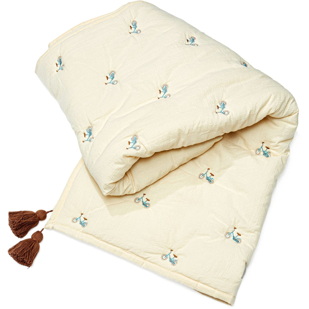 Upplev känslan av tradition och komfort med Cam Cam Copenhagen Bicycles Kids broderade filt. Denna noggrant designade filt är tillverkad av högkvalitativ ekologisk bomull och har en unik bomullscrepe-struktur. Filten skänker inte bara en varm och mysig atmosfär till barnrummet, dess tjocka vaddering gör den både idealisk för lekstunder på golvet och som ett stilfullt överkast. De eleganta tofsarna och de subtila Cam Cam-motiven tillför en förtjusande estetisk touch, vilket gör den till en utmärkt gåva för både barn och föräldrar. Dess mångsidighet och lätta underhåll gör den till ett praktiskt samt charmigt tillskott i varje barns rum.