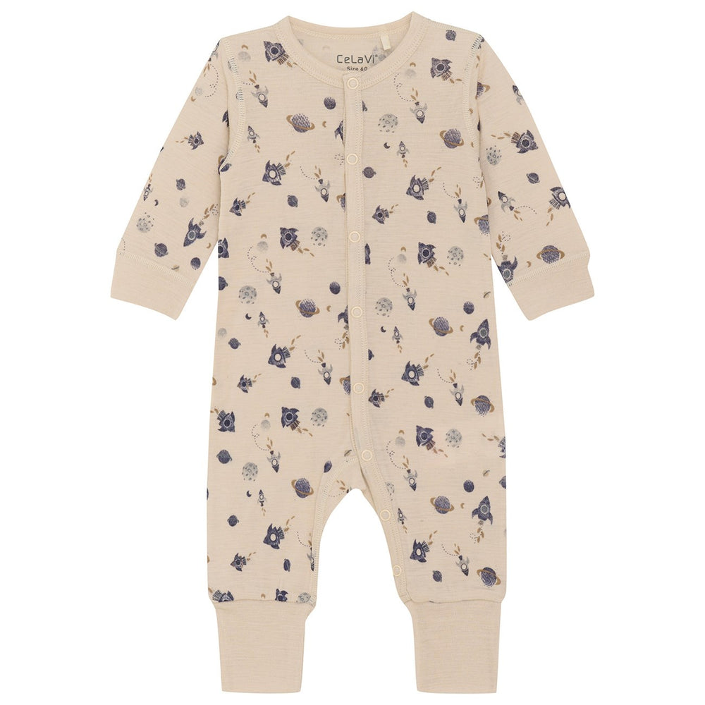 Långärmad baddräkt med heltäckande print i 100% merinoull från CeLaVi. Dräkten öppnas med praktiska tryckknappar framtill och ner på ena benet för enkel av- och påtagning. Den är tillverkad i en ullkvalitet som känns mjuk och skön mot huden. Certifierad enligt OEKO-TEX® STANDARD 100 cert. nr 2276-364 DTI