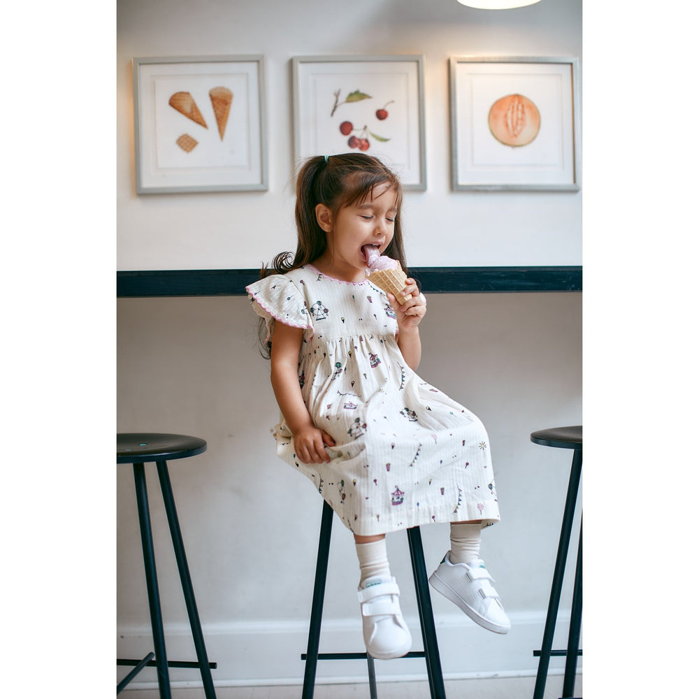 Ge ditt barn en stilfull och bekväm upplevelse med Copenhagen Colors Cream Tivoli Print klänning. Denna charmiga klänning är tillverkad i mjuk och högkvalitativ 100% ekologisk bomull, perfekt för barnets känsliga hud. Med dess lekfulla Tivoli-print och trendiga crèmefärg, är den ett snyggt tillskott i varje barns garderob.