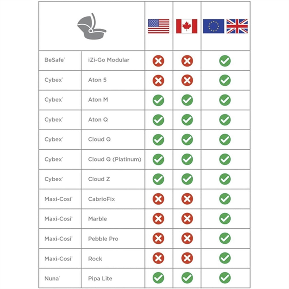 - Kompatibel med Cybex®, Nuna®, BeSafe® eller Maxi Cosi® Group 0/0 + bilseter for å skape et elegant og kompakt reisesystem