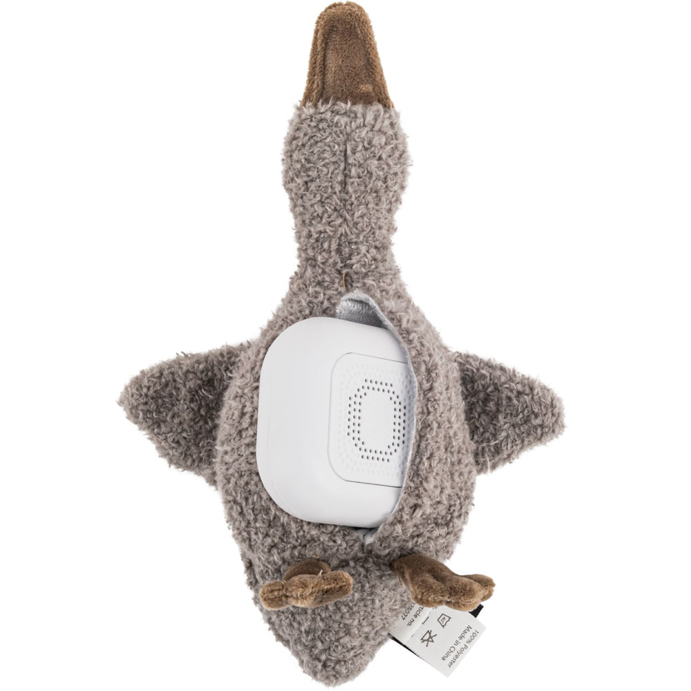 Flow Amsterdam Comforter inkluderar en innovativ speldosa utrustad med två ljudalternativ: hjärtslag och vitt brus. Dessa ljud hjälper till att lugna ditt barn och efterliknar den trygga miljön i hemmet. Med en stor och lättanvänd knapp kan du snabbt justera volymen eller växla mellan ljuden, vilket gör det smidigt även på resande fot.