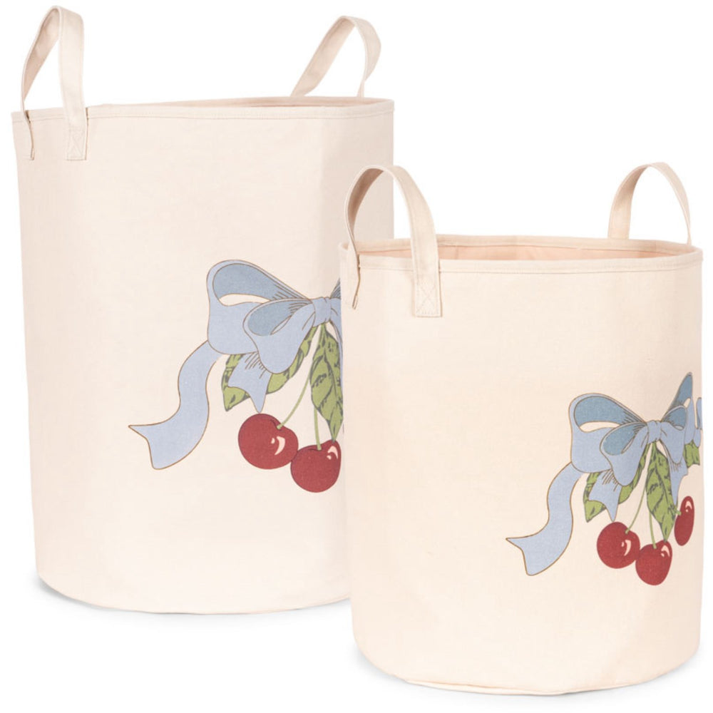 Upptäck Konges Sløjd Cherry Leksak Förvaring Bags Sett, det perfekta valet för att hålla ordning i barnrummet. Dessa två charmerande förvaringspåsar, tillverkade av högkvalitativt bomullstyg, är inte bara praktiska utan också estetiskt tilltalande med deras söta design. Påsarna är lätta att vika ihop och förvara när de inte används. Med måtten på den stora påsen som H: 48 x D: 38 cm och den lilla H: 38 x D: 34 cm erbjuder de gott om plats för allt från leksaker till småsaker. Använd dem för att organisera allt från leksaker till legobitar på ett säkert och tilltalande sätt. Perfekt för att skapa en stimulerande och funktionell miljö i ditt barns lekrum.