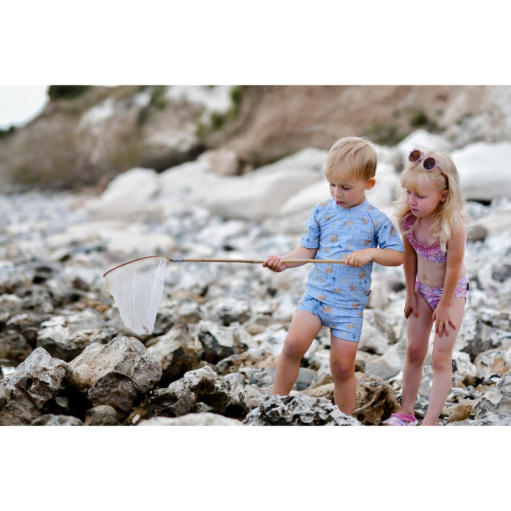 Dyk in i sommaren på ett säkert sätt med denna iögonfallande Mikk-Line Faded Denim AOP UV-skjorta, perfekt designad för pojkar som älskar stil och solskydd. Den här badtröjan är tillverkad av återvunnen polyester och har inte bara ett, utan två livfulla mönster som garanterar en enastående look. Med sin åtsittande passform och UV 50-skydd håller den unga simmare säkra och bekväma under solen. Den här tröjan är certifierad enligt OEKO-TEX® Standard 100 och garanterar säkerhet och miljöhänsyn i sitt skapande. Tänk på att skölja i rent vatten efter varje användning för att behålla dess härliga utseende och funktionalitet säsong efter säsong. Oavsett om det är en dag i poolen eller ett havsäventyr är den här badtröjan ett måste!