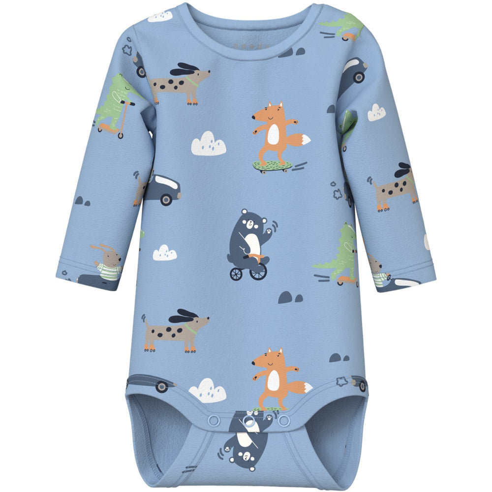 Sköt om denna charmiga bodysuit enkelt - den är maskintvättbar och håller sig både snygg och funktionell tvätt efter tvätt. Låt ditt barn utforska sin värld med stil och komfort med "Name It Cerulean Animals In Motion Vroels Body".