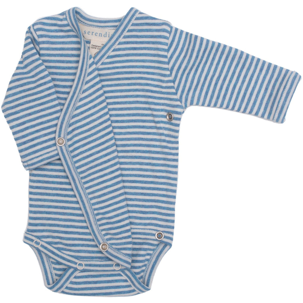 Upptäck vår Serendipity Azur/Ecru Newborn Omlott Body, en randig omlottbody perfekt designad för de allra minsta. Tillverkad i 100% ekologisk bomull med GOTS-certifiering, garanterar denna body både komfort och hållbarhet. Den smarta azurblå och benvita färgsättningen i mjuk ribbad textur, tillsammans med praktiska tryckknappar och extra sidöppning för rör på storlekar 38-44, gör den idealisk för nyfödda. En både stilren och funktionell basplagg för din bebis garderob.