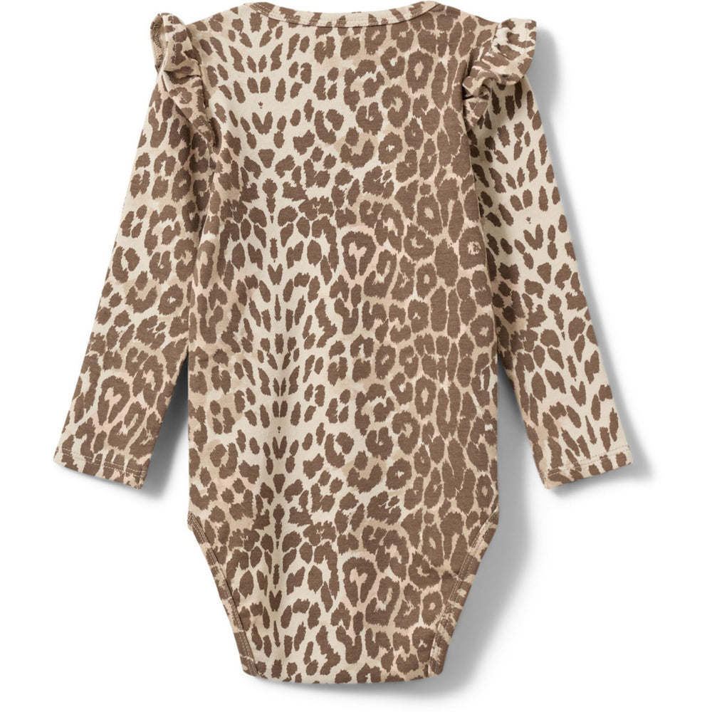 Se din lilla hoppa och leka i Sofie Schnoor Leopard Dictekb Bodystocking! Denna charmiga beige bodysuit har ett roligt leopardmönster med bedårande volanger på axlarna för en touch av stil. De långa ärmarna och den runda halsringningen ger en mysighet, medan knappknappen längst ner gör det enkelt att klä på. Den är perfekt både för vilotid och djungeläventyr i vardagsrummet!