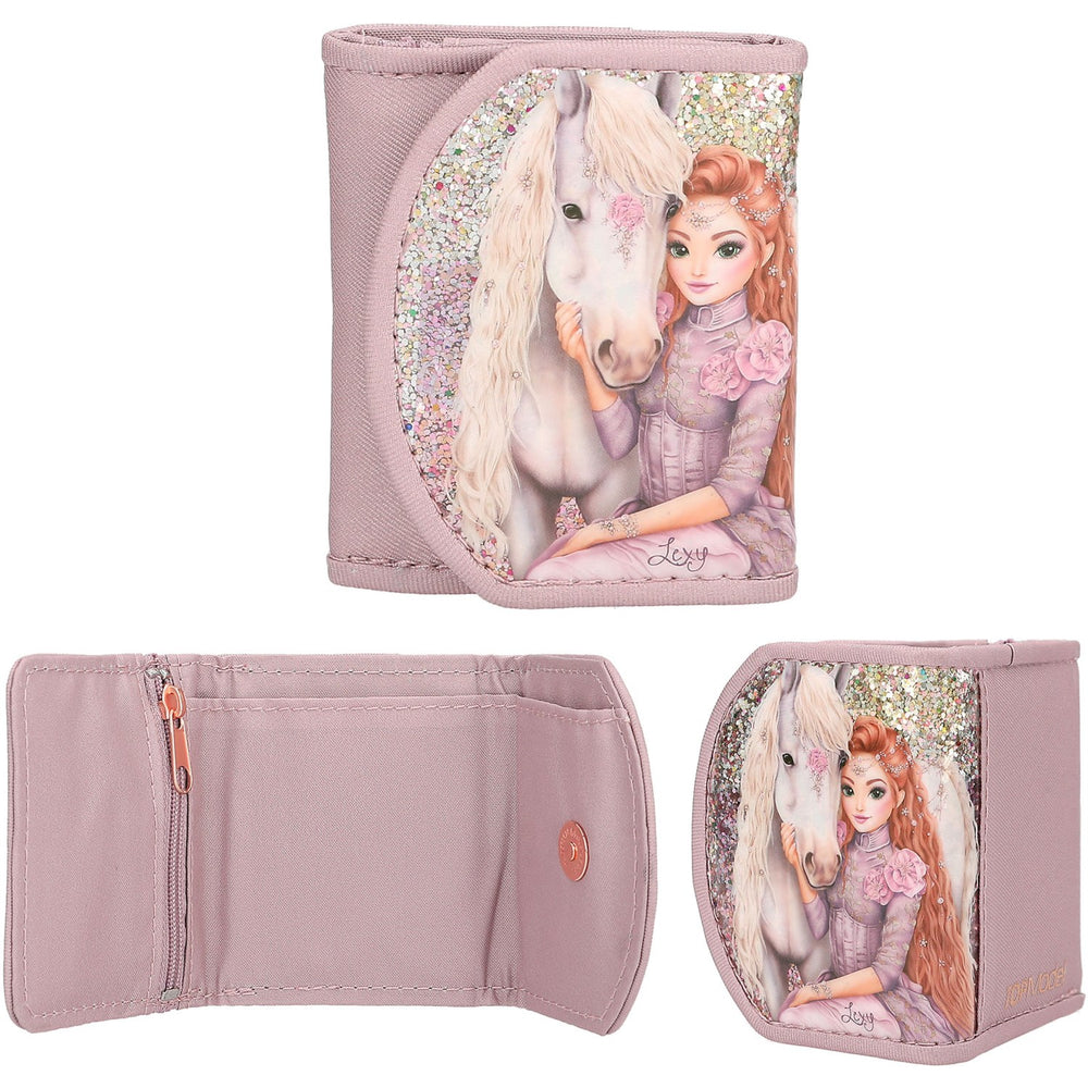 Viva Violet-plånboken från TOPModel är perfekt för ditt barns första plånbok. Denna lilla, dämpade lila accessoar glittrar vackert på framluckan och pryds av ett elegant modellmotiv med en häst. Med praktiska förvaringsmöjligheter som sedelfack och en myntficka med dragkedja, är den lika användarvänlig som den är charmig. Plånboken, gjord av hållbart polyester och PVC, stängs säkert med en magnetknapp, vilket gör den både bekväm och säker för små händer.