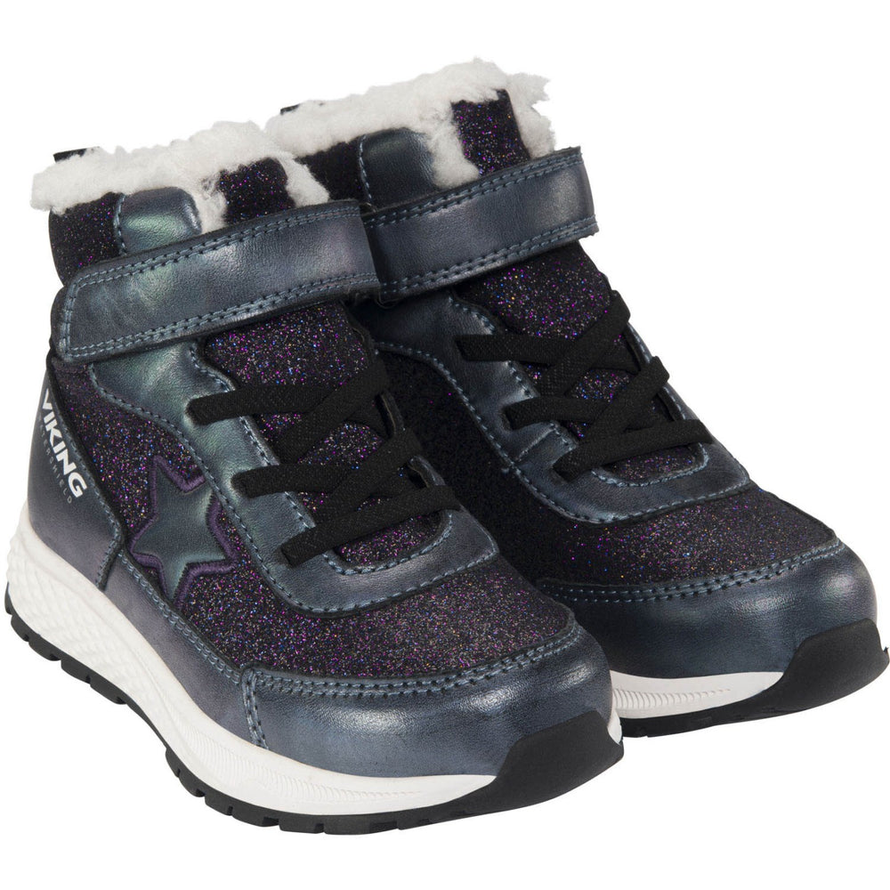 Upptäck VIKING Black Equip Star Warm WP 1V SL vinterkängor – en idealisk följeslagare för ditt barns lekfulla dagar. Dessa kängor kombinerar nytänkande design och exceptionell bekvämlighet. Tillverkade med Vikings Watershield-membran, är de optimala för att hålla små fötter torra och varma tack vare det isolerande lagret. Materialvalet är enastående med en robust och glittrig iriserande ovandel, kompletterad med elastiska snören och kardborreband, vilket underlättar en justerbar och personlig passform. Den livfulla färgsättningen och det iögonfallande mönstret gör dessa kängor både praktiska och stiliga. Den slitstarka gummiyttersulan säkerställer stabilt grepp under alla lekar, medan skons konstruktion stödjer aktivt spel. Låt ditt barn uppleva vinterns äventyr med komfort och stil.